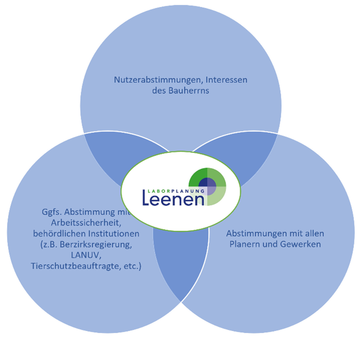 Die Planung eines Labors folgt hierbei eigenen Regeln, die jedoch eng in die Bereiche der Architektur, Haustechnik und anderer Gewerke integriert werden muss.